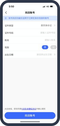 找回賬號適用于身份信息已綁定歷史賬號,但歷史賬號手機(jī)號又停用,無法操作更換手機(jī)號的情況;客戶可以通過綁定的身份找回賬號并更換為新手機(jī)號